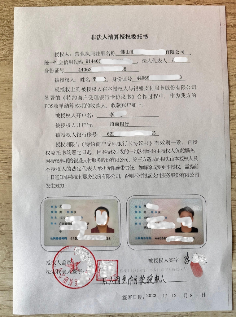 变更:银盛变更非法人结算卡材料 入件时需要结算非法人银行卡请提供以下照片(文档可在下面附件下载) 银盛非法人清算授权委托书下载 已经入件但依然需要变更结算卡请下载《银盛信息及业务变更申请表》签字盖章(其他资料不要填) 银盛信息及业务变更申请表下载